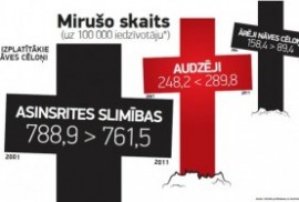 Jau desmit gadus Latvijā galvenie iedzīvotāju mirstības rādītāji ir tādi paši – 2001. gadā pirmajā vietā bija sirds asinsvadu slimības, un tās bija nāves cēlonis vairāk nekā pusē nāves...